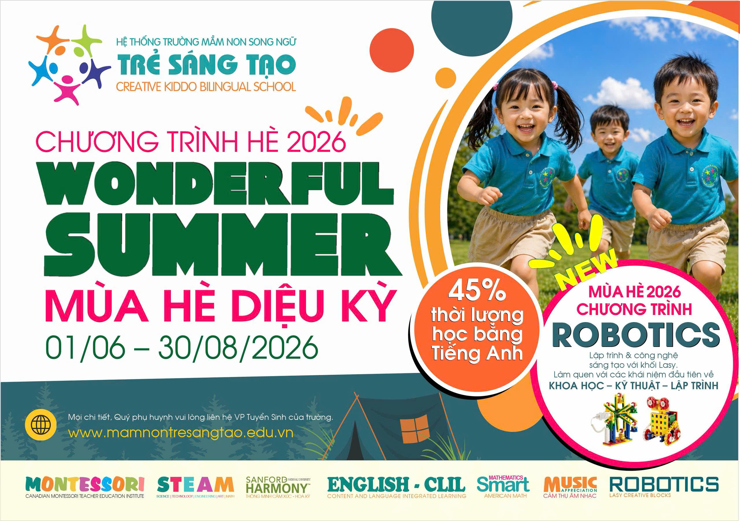 Mùa hè này, hãy để con bước vào hành trình khám phá đầy hào hứng và ý nghĩa cùng WONDERFUL SUMMER 2026 tại Hệ Thống Mầm Non Song Ngữ Trẻ Sáng Tạo.